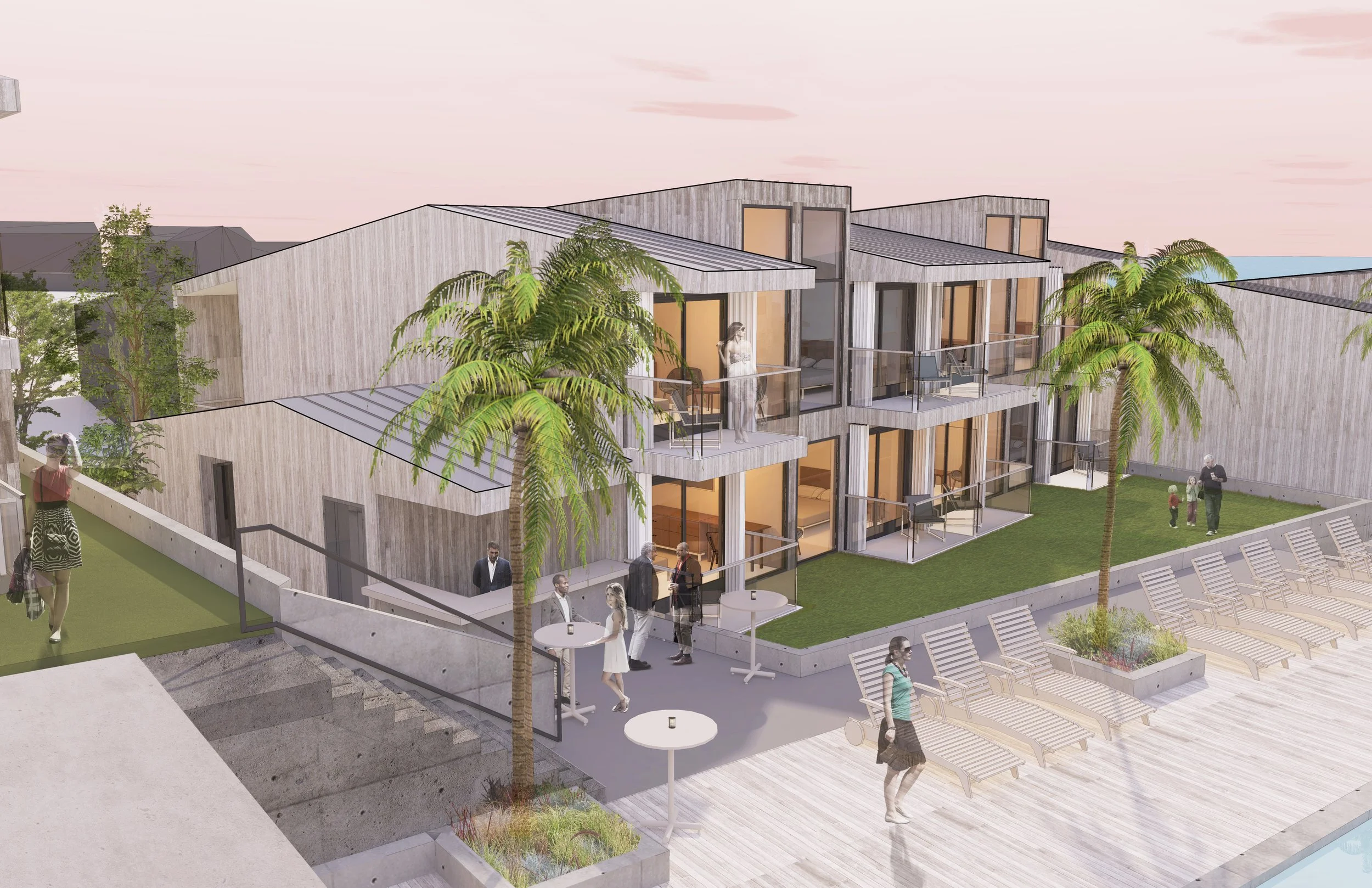 This oceanside, ground-up hotel in Pismo Beach features sprawling modern beach cottages oriented to ocean views while maintaining the view corridor from the adjacent Pacific Coast Highway, as is required by the California Coastal Commission. The grounds also include a centrally-located pool amenity above a 100-car parking garage.